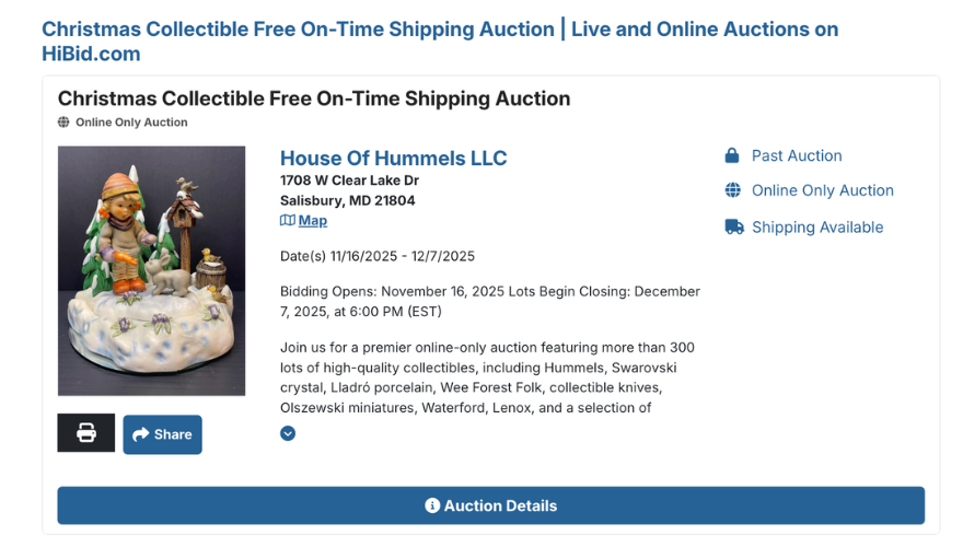 Our auctions consistently draw strong national interest from serious Hummel buyers. High quality photos, accurate descriptions, and free U.S. shipping bring in serious collectors and competitive bidding rather than local bargain hunters. View our past Hummel auctions and see how well-curated Hummels perform when they reach the right audience.